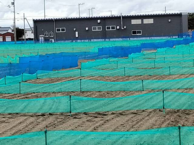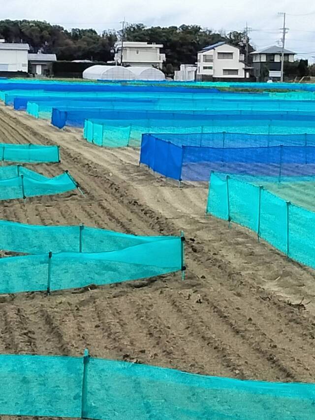 畑に肥料をやった後、砂が飛ぶのを防ぐために防風ネットを設置しました。
